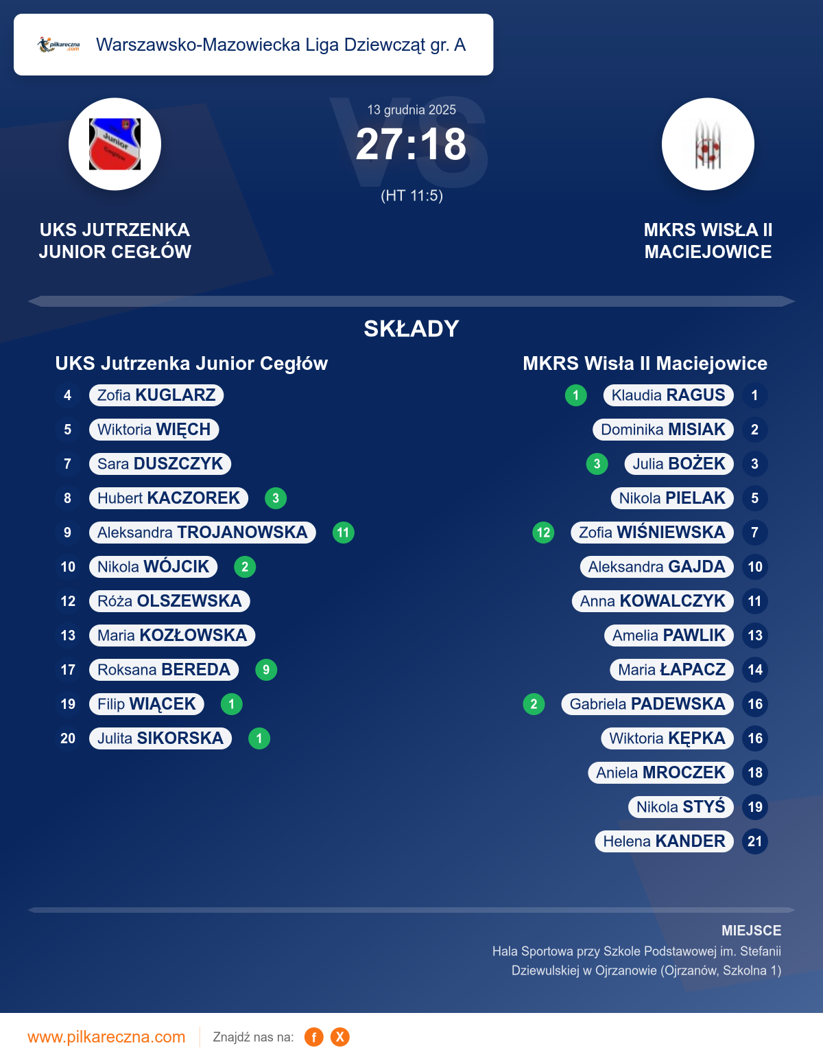 UKS Jutrzenka Junior Cegłów 27–18 MKRS Wisła II Maciejowice