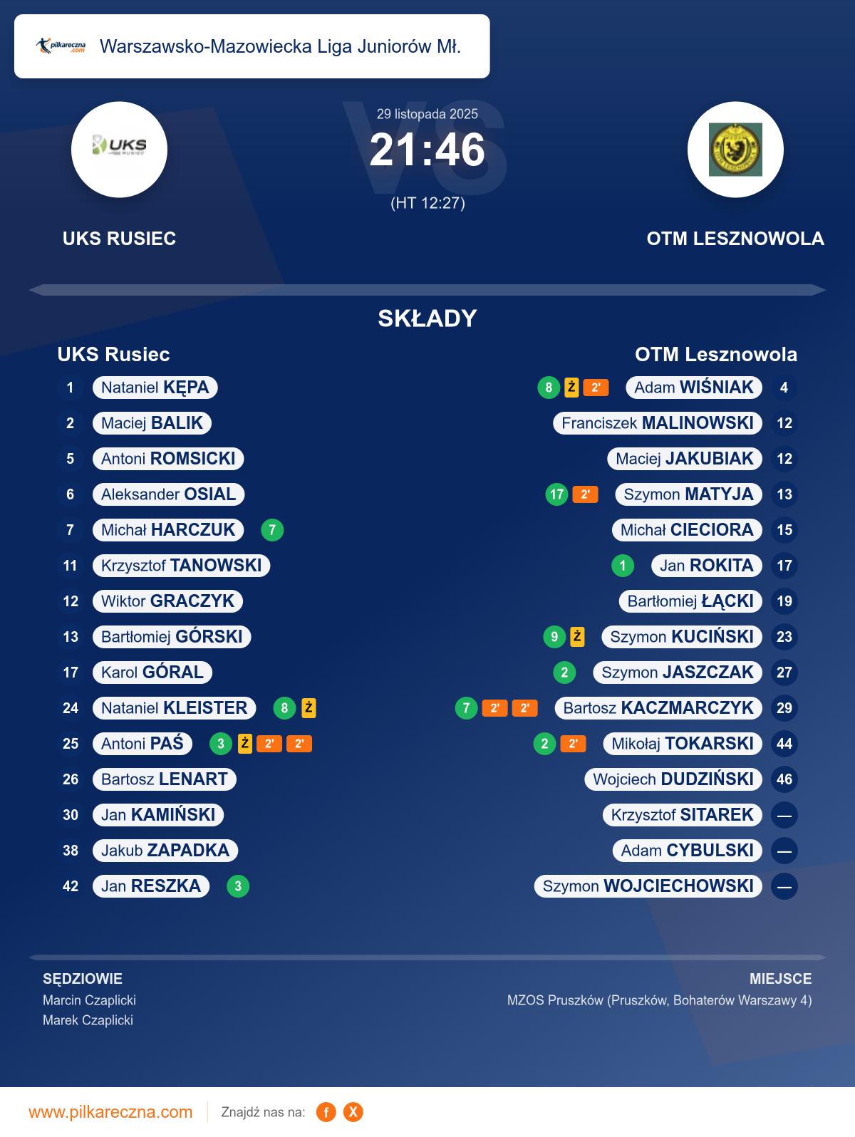 Zawodnicy: Nataniel Kleister (8), Michał Harczuk (7), Antoni Paś (3), Jan Reszka (3), Aleksander Osial, Antoni Romsicki, Bartłomiej Górski, Bartosz Lenart, Jakub Zapadka, Jan Kamiński, Karol Góral, Krzysztof Tanowski, Maciej Balik