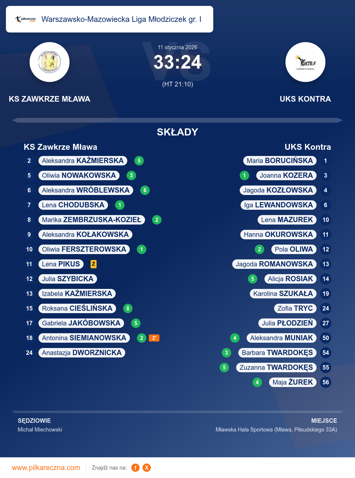 Zawodnicy: Roksana Cieślińska (8), Aleksandra Wróblewska (6), Aleksandra Każmierska (5), Gabriela Jakóbowska (5), Oliwia Nowakowska (3), Antonina Siemianowska (2), Marika Zembrzuska-kozieł (2), Lena Chodubska (1), Oliwia Ferszterowska (1), Aleksandra Kołakowska, Izabela Każmierska, Julia Szybicka, Lena Pikus