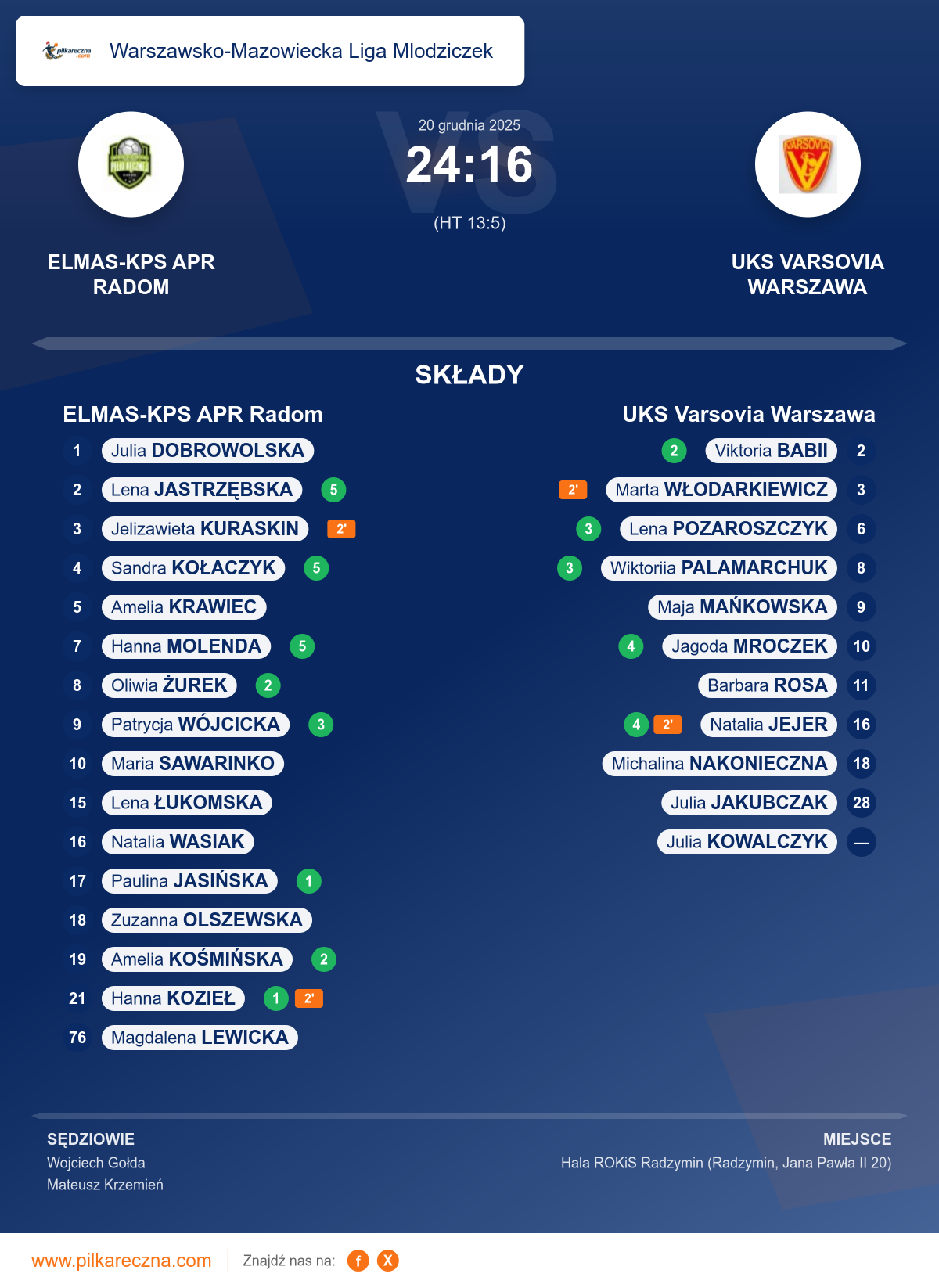 Zawodnicy: Hanna Molenda (5), Lena Jastrzębska (5), Sandra Kołaczyk (5), Patrycja Wójcicka (3), Amelia Kośmińska (2), Oliwia Żurek (2), Hanna Kozieł (1), Paulina Jasińska (1), Amelia Krawiec, Jelizawieta Kuraskin, Lena Łukomska, Maria Sawarinko, Natalia Wasiak, Zuzanna Olszewska