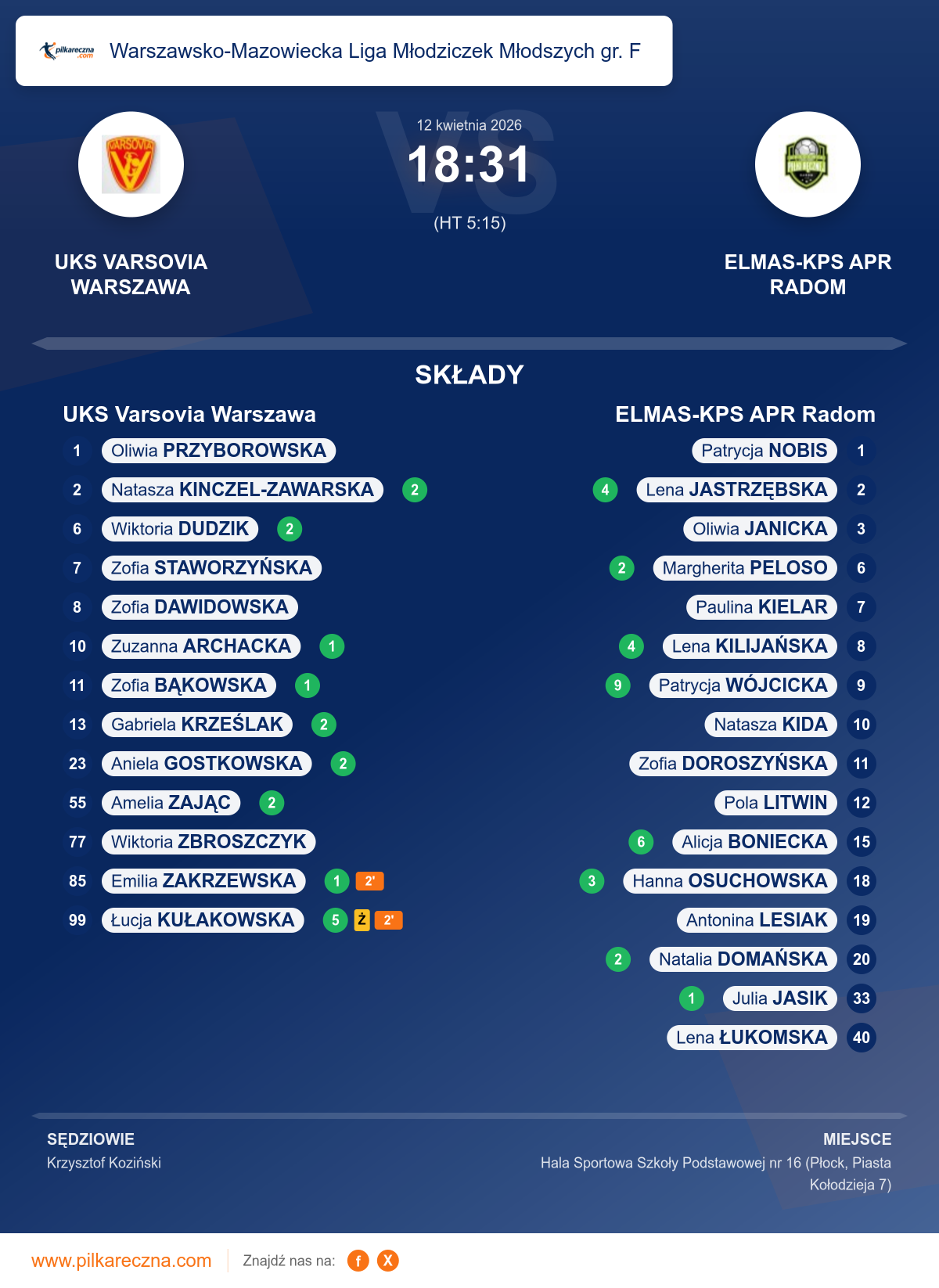 Zawodnicy: Łucja Kułakowska (5), Amelia Zając (2), Aniela Gostkowska (2), Gabriela Krześlak (2), Natasza Kinczel-zawarska (2), Wiktoria Dudzik (2), Emilia Zakrzewska (1), Zofia Bąkowska (1), Zuzanna Archacka (1), Wiktoria Zbroszczyk, Zofia Dawidowska, Zofia Staworzyńska