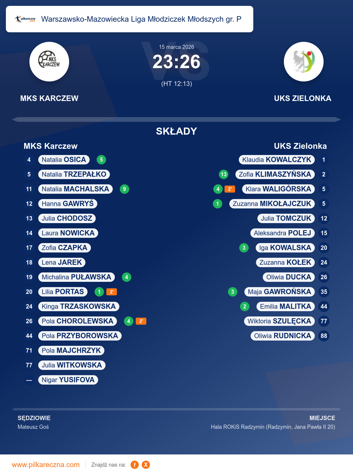 Zawodnicy: Zofia Klimaszyńska (13), Klara Waligórska (4), Iga Kowalska (3), Maja Gawrońska (3), Emilia Malitka (2), Zuzanna Mikołajczuk (1), Aleksandra Polej, Klaudia Kowalczyk, Oliwia Ducka, Oliwia Rudnicka, Wiktoria Szulęcka, Zuzanna Kołek