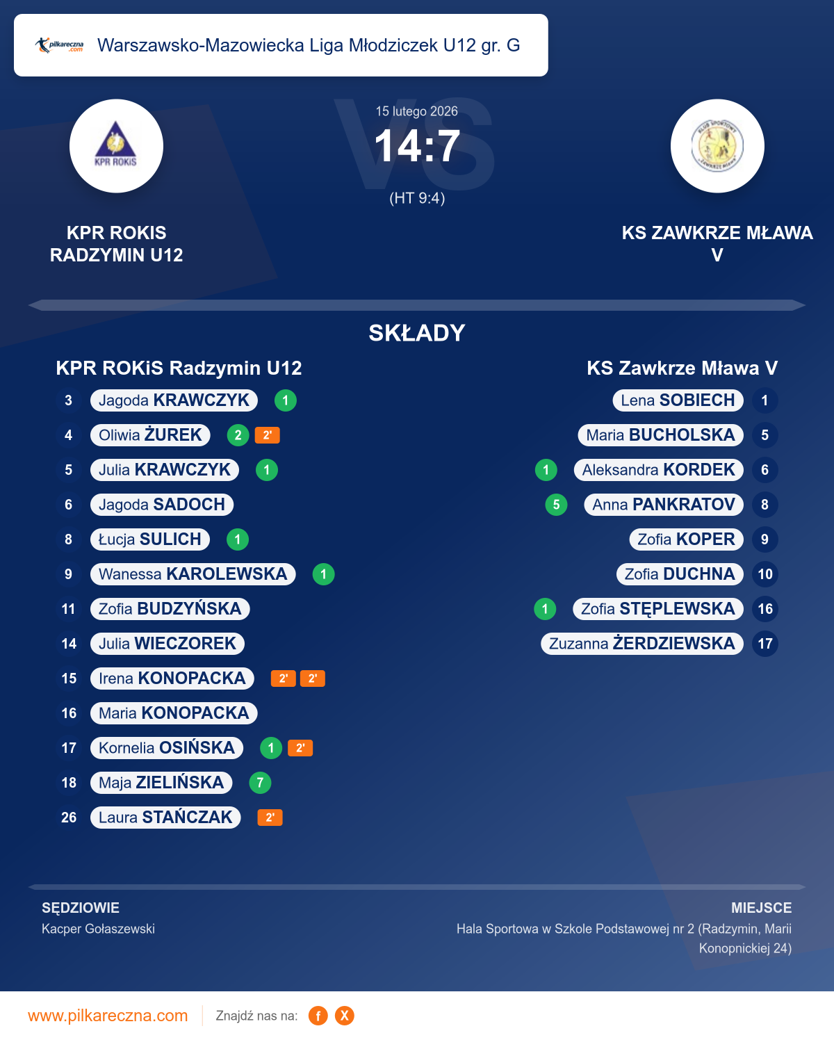 Zawodnicy: Maja Zielińska (7), Oliwia Żurek (2), Jagoda Krawczyk (1), Julia Krawczyk (1), Kornelia Osińska (1), Łucja Sulich (1), Wanessa Karolewska (1), Irena Konopacka, Jagoda Sadoch, Julia Wieczorek, Laura Stańczak, Maria Konopacka, Zofia Budzyńska