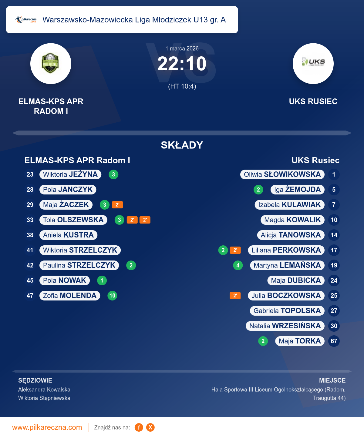 Zawodnicy: Zofia Molenda (10), Maja Żaczek (3), Tola Olszewska (3), Wiktoria Jeżyna (3), Paulina Strzelczyk (2), Pola Nowak (1), Aniela Kustra, Pola Janczyk