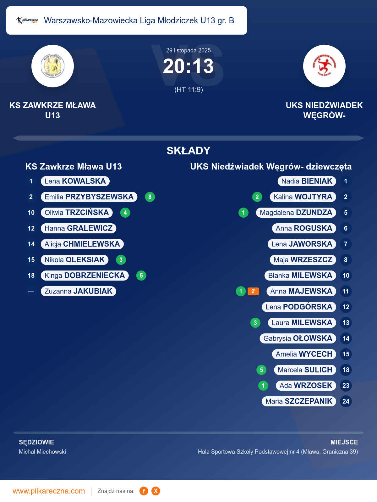 KS Zawkrze Mława U13 20–13 UKS Niedźwiadek Węgrów- dziewczęta