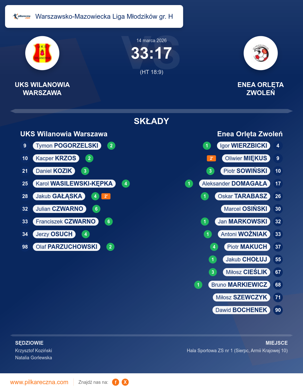 UKS Wilanowia Warszawa 33–17 Enea Orlęta Zwoleń