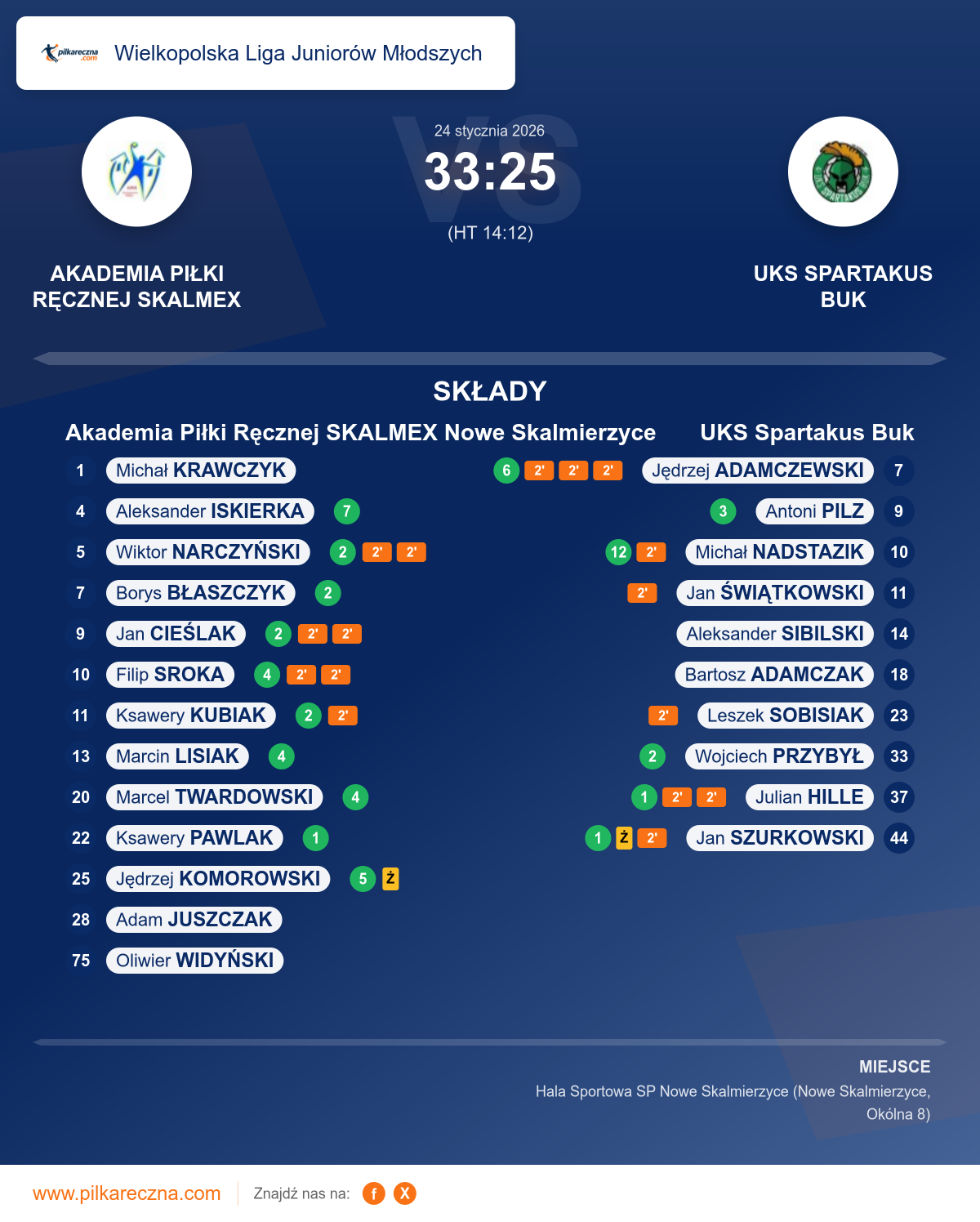 Akademia Piłki Ręcznej SKALMEX Nowe Skalmierzyce 33–25 UKS Spartakus Buk