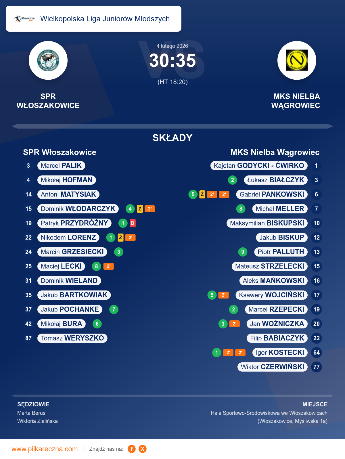 Uwagi: w 15 minucie meczu trener drużyny gości Świerad Bartosz otrzymał upomnienie zgodnie z przepisem 16.1 b w związku z 8.7a zawodnik drużyny gospodarzy Przydróżny Patryk grający z nr 19 otrzymał karę dyskwalifikacji zgodnie z przepisem 8.5b zawodnik drużyny gospodarzy doznał urazu prawego kolana Lorenz Nikodem z nr 22 dodatkowy raport sędziów po meczu: po meczu zawodnicy drużyny gości mks nielba wągrowiec otworzyli drzwi od szatni wykrzykując do sekretarza zawodów "jebać cię stolikowy" świadkiem zdarzenia była sędzia Marta Berus. żaden z zawodników nie przyznał się osobowo do tych słów