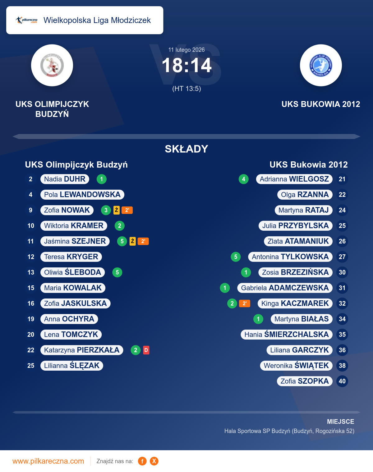 Uwagi: w 31:14 minucie spotkania zawodniczka drużyny A UKS Olimpijczyk Budzyń z nr 22 Katarzyna Pierzkała została ukarana kara dyskwalifikacji zgodnie z przepisem 8.5a