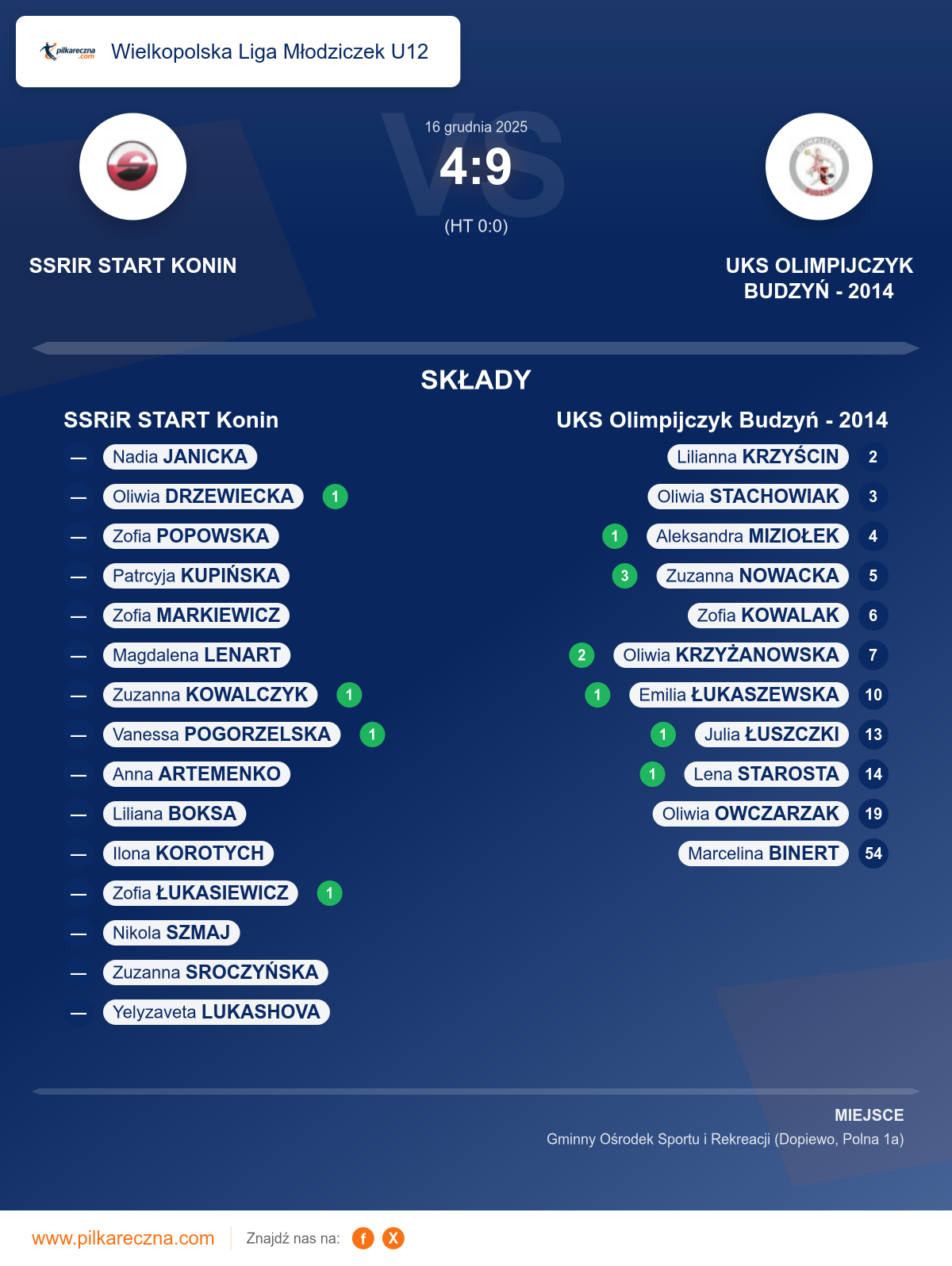Zawodnicy: Zuzanna Nowacka (3), Oliwia Krzyżanowska (2), Aleksandra Miziołek (1), Emilia Łukaszewska (1), Julia Łuszczki (1), Lena Starosta (1), Lilianna Krzyścin, Oliwia Owczarzak, Oliwia Stachowiak, Zofia Kowalak