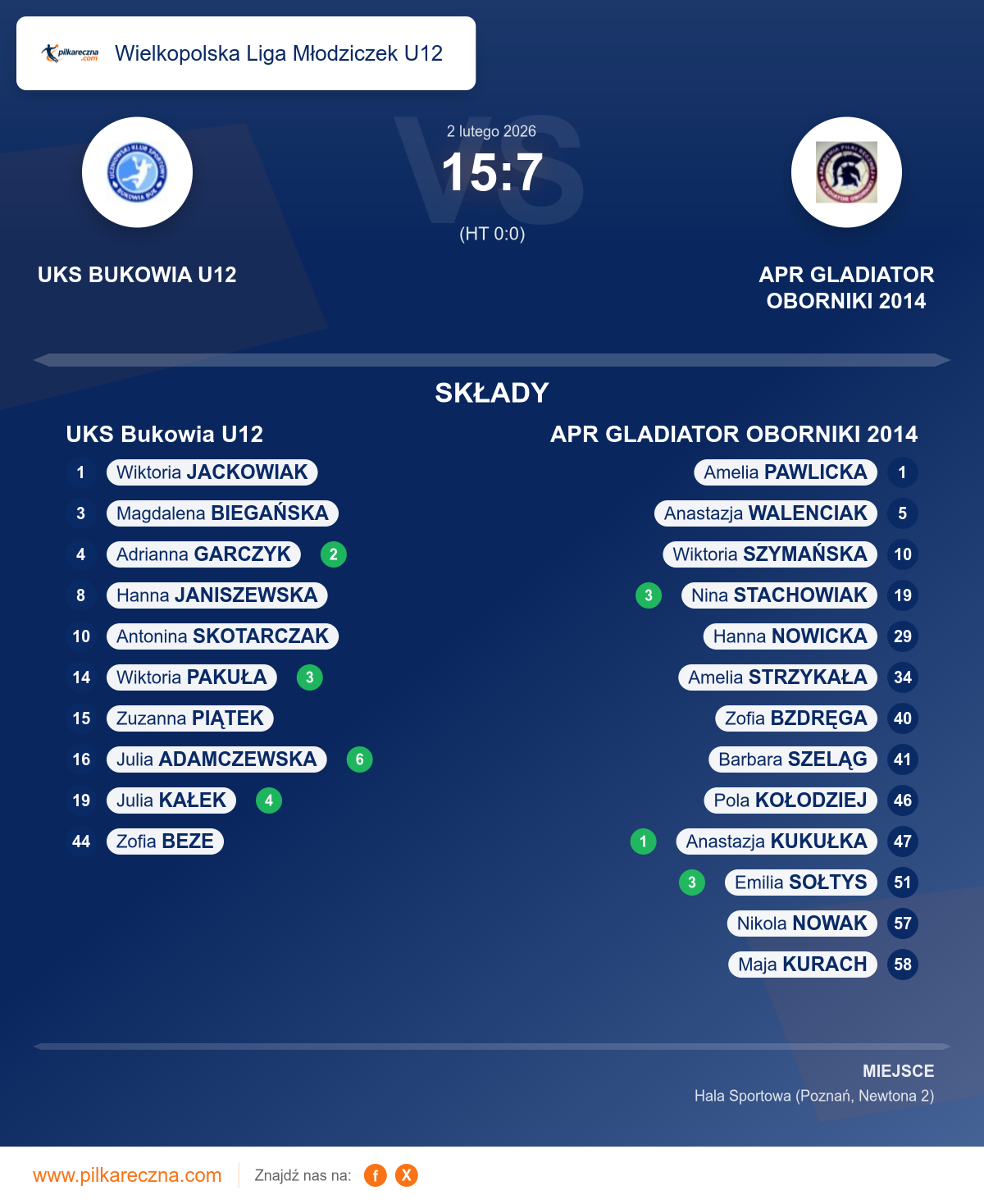 Zawodnicy: Julia Adamczewska (6), Julia Kałek (4), Wiktoria Pakuła (3), Adrianna Garczyk (2), Antonina Skotarczak, Hanna Janiszewska, Magdalena Biegańska, Zuzanna Piątek