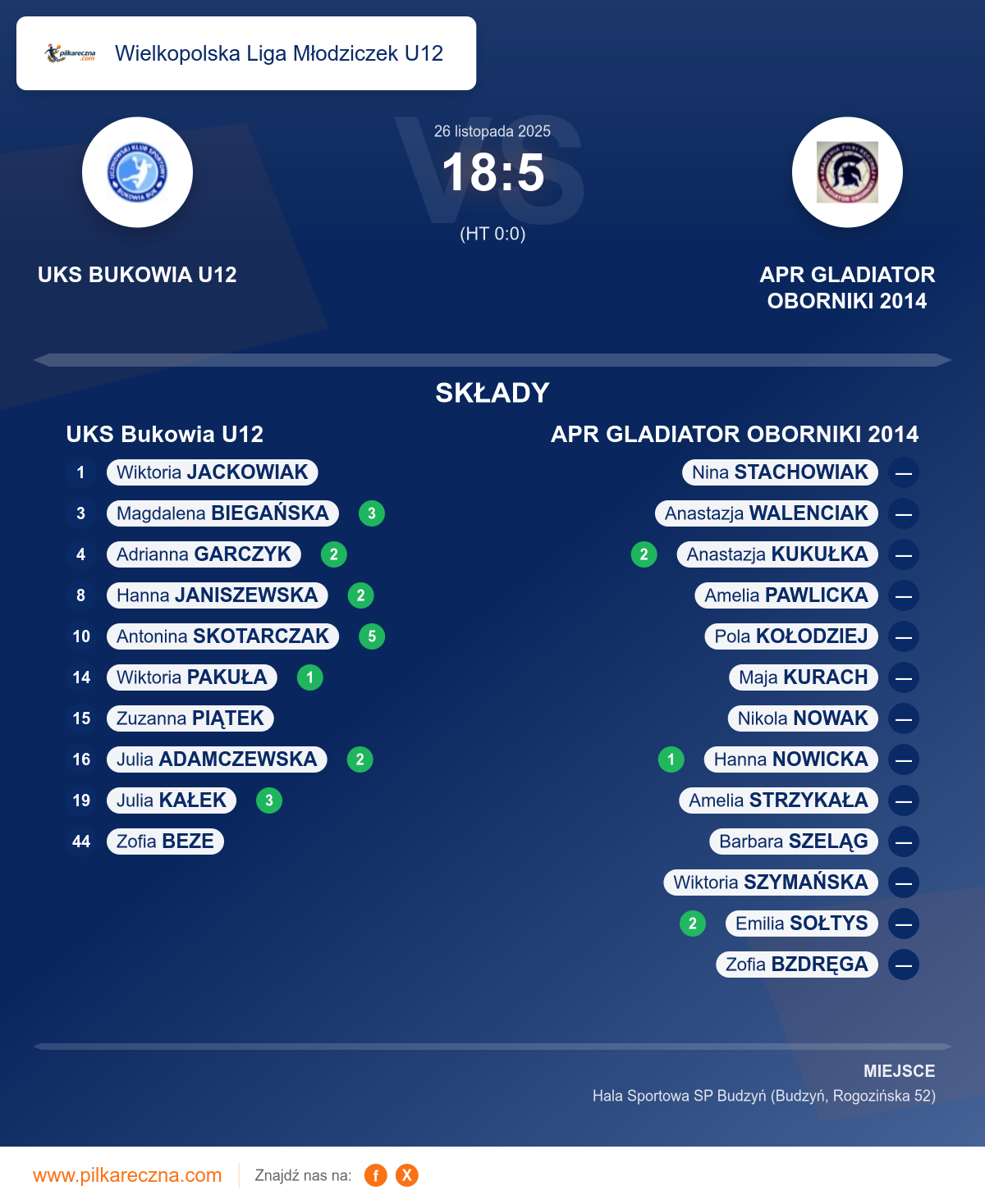 Zawodnicy: Antonina Skotarczak (5), Julia Kałek (3), Magdalena Biegańska (3), Adrianna Garczyk (2), Hanna Janiszewska (2), Julia Adamczewska (2), Wiktoria Pakuła (1), Zuzanna Piątek