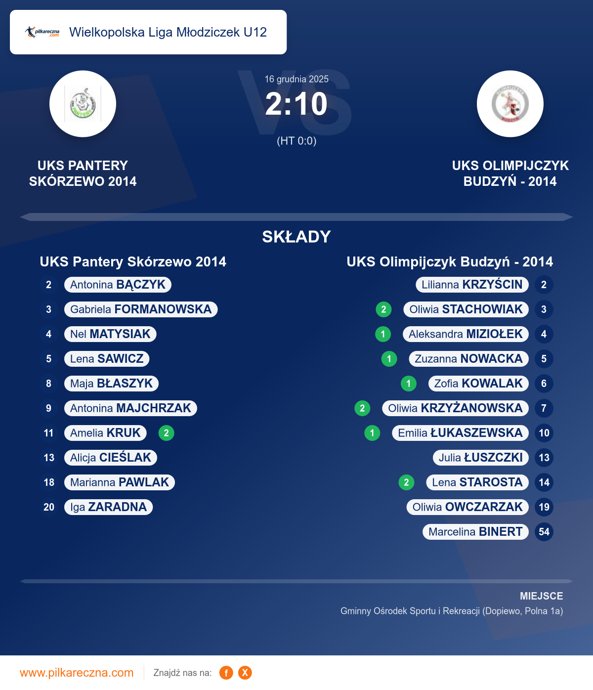 Zawodnicy: Lena Starosta (2), Oliwia Krzyżanowska (2), Oliwia Stachowiak (2), Aleksandra Miziołek (1), Emilia Łukaszewska (1), Zofia Kowalak (1), Zuzanna Nowacka (1), Julia Łuszczki, Lilianna Krzyścin, Oliwia Owczarzak
