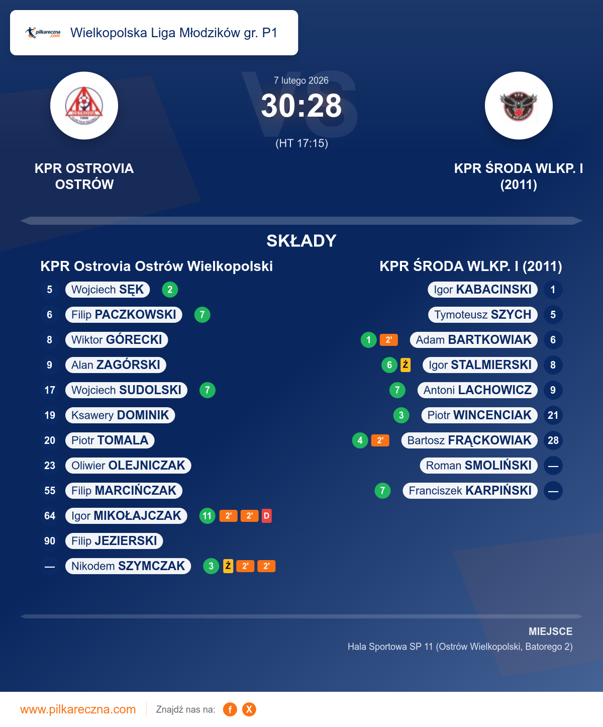 Uwagi: zawodnik drużyny gospodarzy KPR Ostrovia Ostrów Wlkp z nr 64 Mikołajczak Igor został ukarany kara dyskwalifikacji za faul na zawodniku będącym w kontrataku z przepisu 8.5a