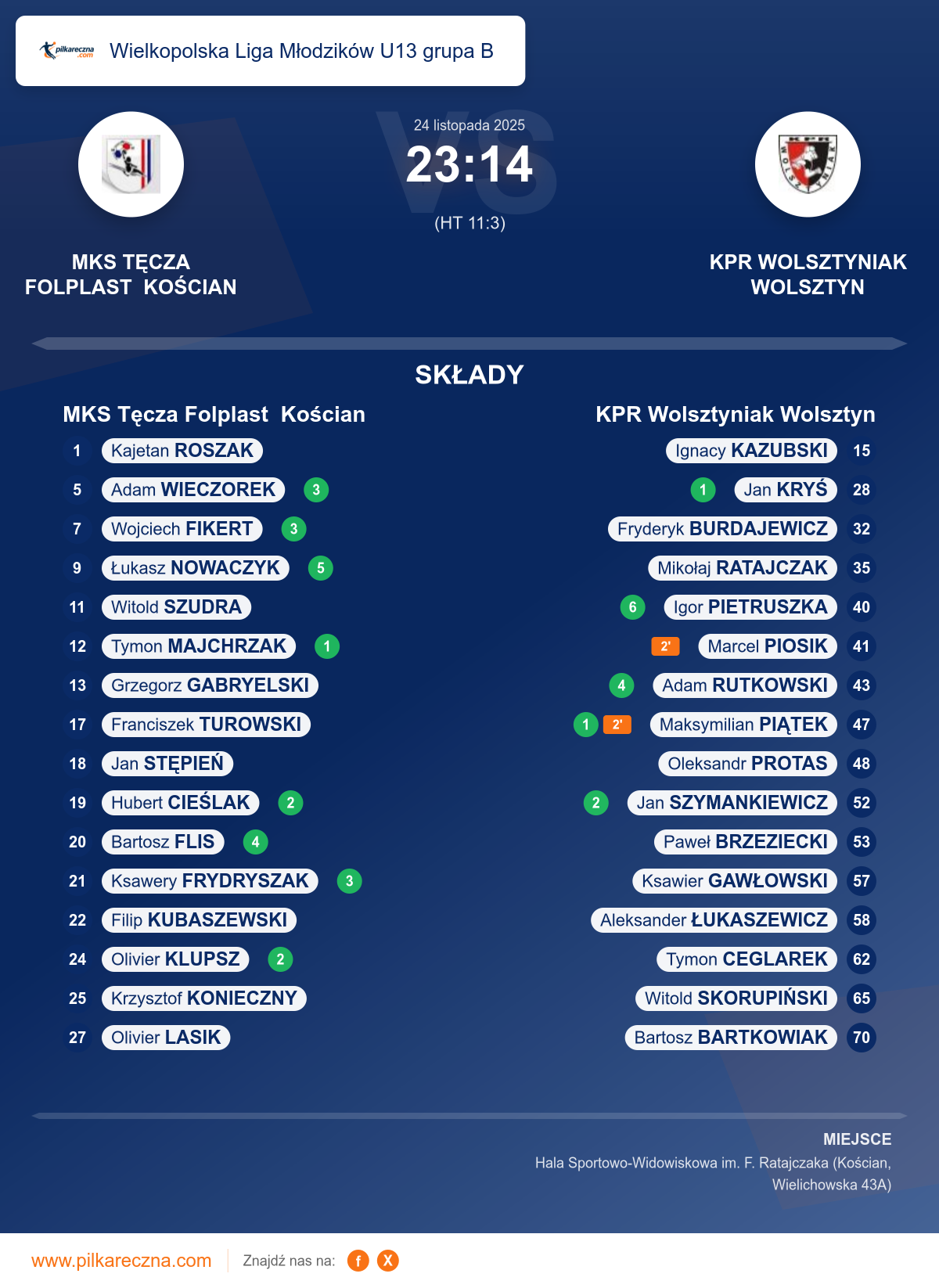 Hala: Hala Sportowo-Widowiskowa im. F. Ratajczaka (Kościan, Wielichowska 43A)