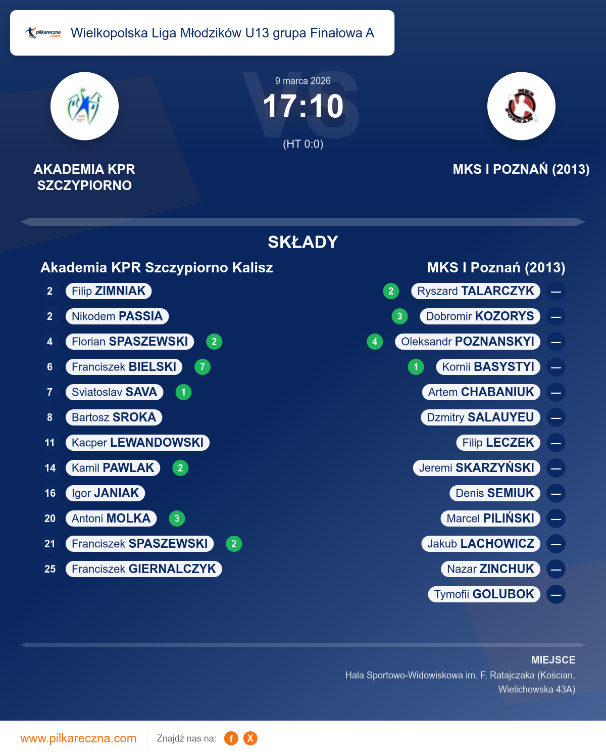 Hala: Hala Sportowo-Widowiskowa im. F. Ratajczaka (Kościan, Wielichowska 43A)