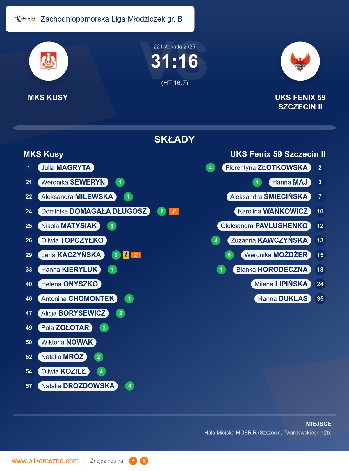 MKS Kusy 31–16 UKS Fenix 59 Szczecin II