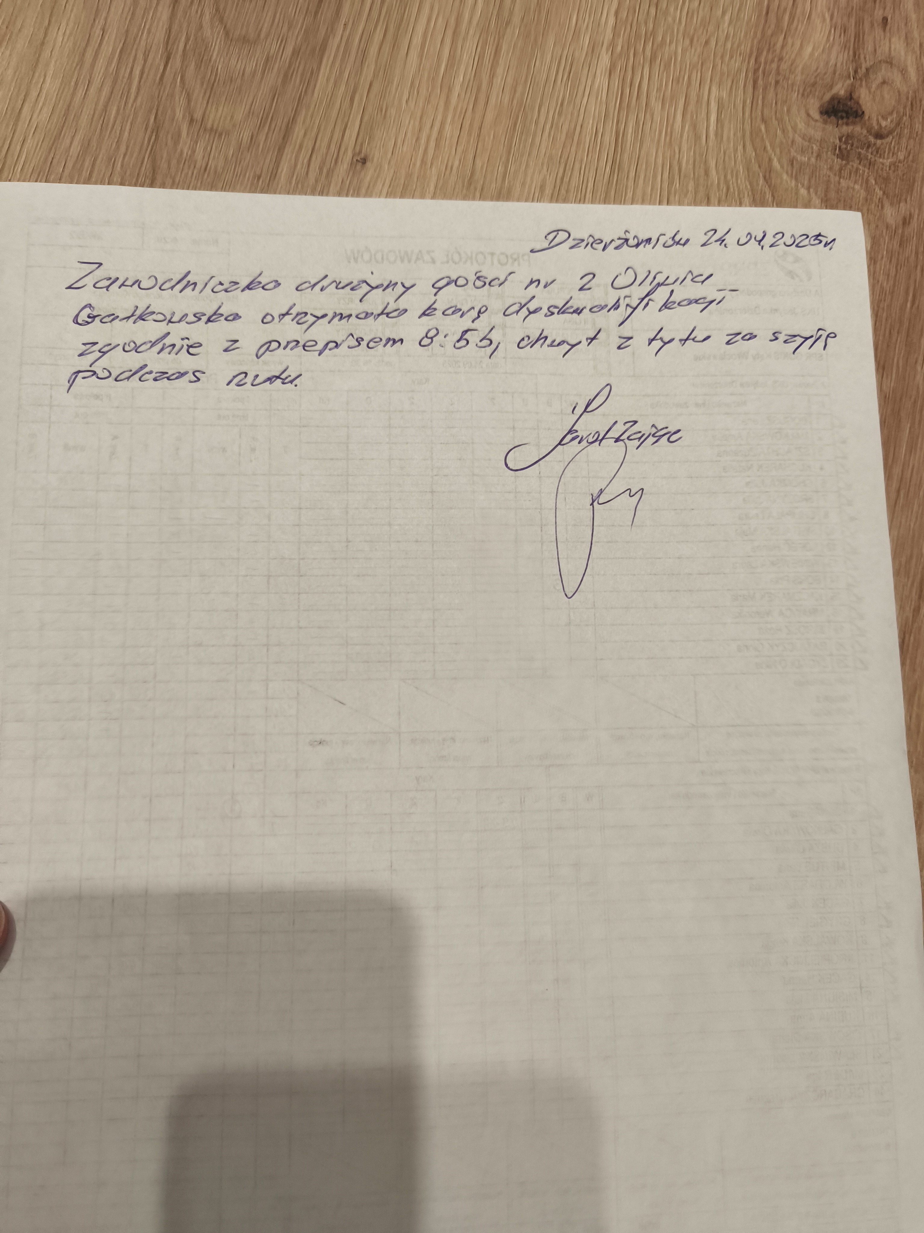 Zawodnik drużyny gości nr 2 Gałkowska Oliwia otrzymała karę dyskwalifikacji zgodnie z przepisem 8.5b chwyt z tyłu za szyje podczas rzutu